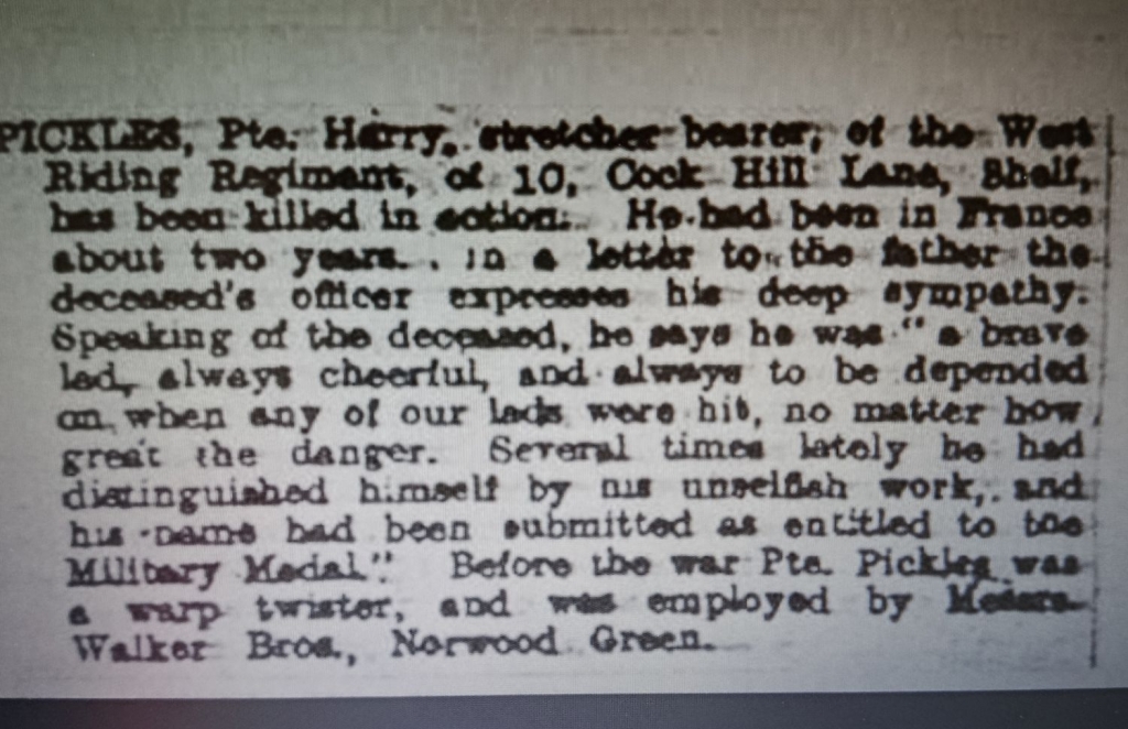 - Son of Mrs. Violet Pickles, of 23, Carr House Lane, Shelf, Halifax.