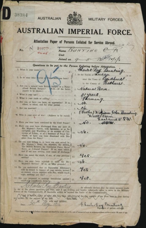 - Enlisted 30 Mat 1916, RAS Grounds, New South Wales