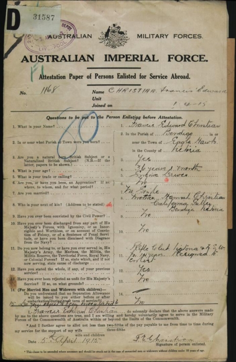 - Enlisted 1 April 1915, Liverpool, New South Wales